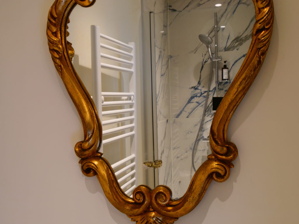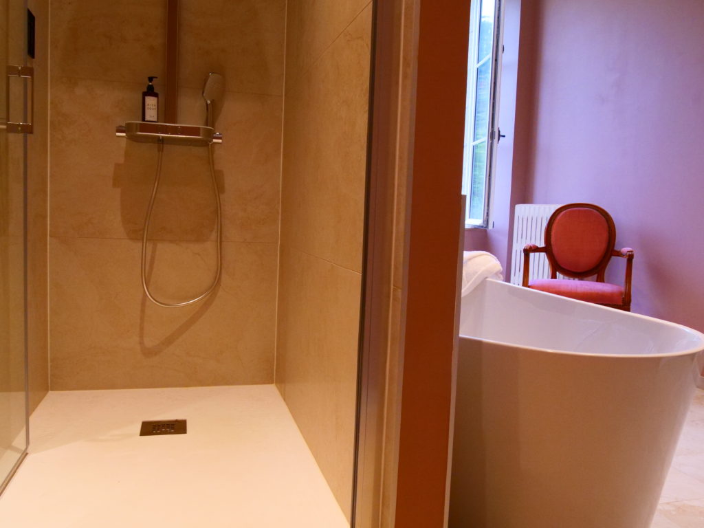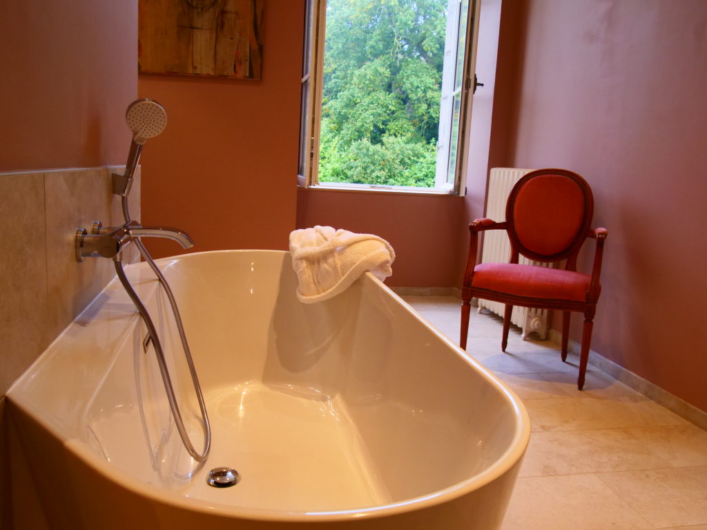 La décoration de cette chambre vous invite au voyage.  Avec ses couleurs ocres, le lit à baldaquin, la vue sur le parc et le bain de lumière matinale… laissez vous aller à vos rêveries. Ouvrez la porte fenêtre de sa salle de bain à la décoration intense lorsque vous prendrez votre bain face à la beauté verdoyante du parc !